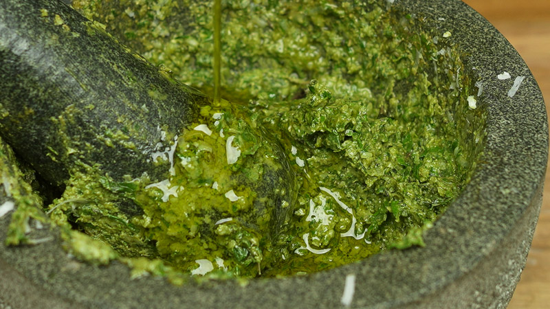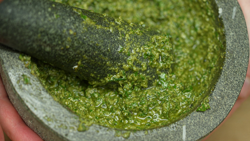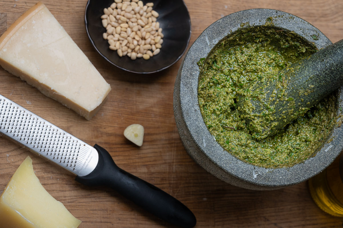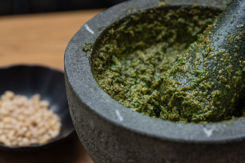 Below, I will describe step by step how you can make authentic pesto at home using the traditional method with pestle & mortar.