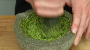 Add ⅓ of the basil and crush together with the coarse sea salt. From time to time, add the remaining basil and crush as long until you'll get a texture you like. The texture wont be as homogenous as when made in a food processor, but in my opinion That is what makes an authentic, handmade pesto so special.