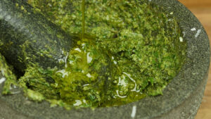 First, crush the garlic in the mortar to a smooth paste. Now add the pine nuts and also crush to a paste.