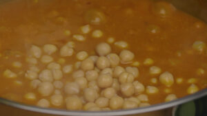 Remove the lid and add the chickpeas. Now, just roughly blend a few times with a hand blender. The curry should get a thicker consistancy but there should remain some larger chunks.