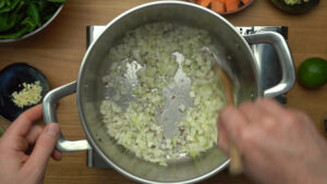 Add the finely diced onions and fry until golden and soft. Now reduce the heat a little and add the ground ginger and garlic. Fry for another 3-4 minutes until soft.