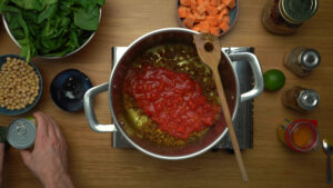500 grams Sweet Potatoes (diced), 400 grams Pelati (Canned Crushed Tomatoes), 400 grams Coconut Milk, 400 grams water (1 can), salt
