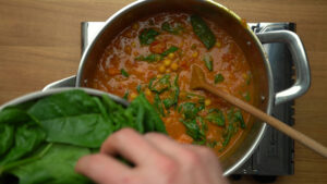 Step by Step, add the fresh spinach and stir it into the curry. The large spinach leaves will fall together in the hot curry, but you might have to add them step by step.